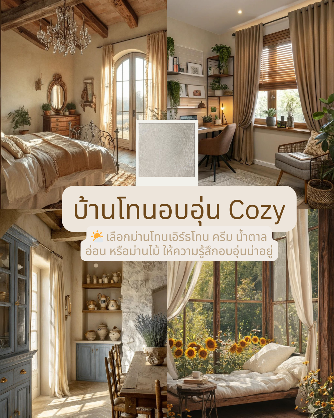 🌤 บ้านโทนอบอุ่น Cozy → เลือกม่านโทนเอิร์ธโทน ครีม น้ำตาลอ่อน หรือม่านไม้ ให้ความรู้สึกอบอุ่นน่าอยู่