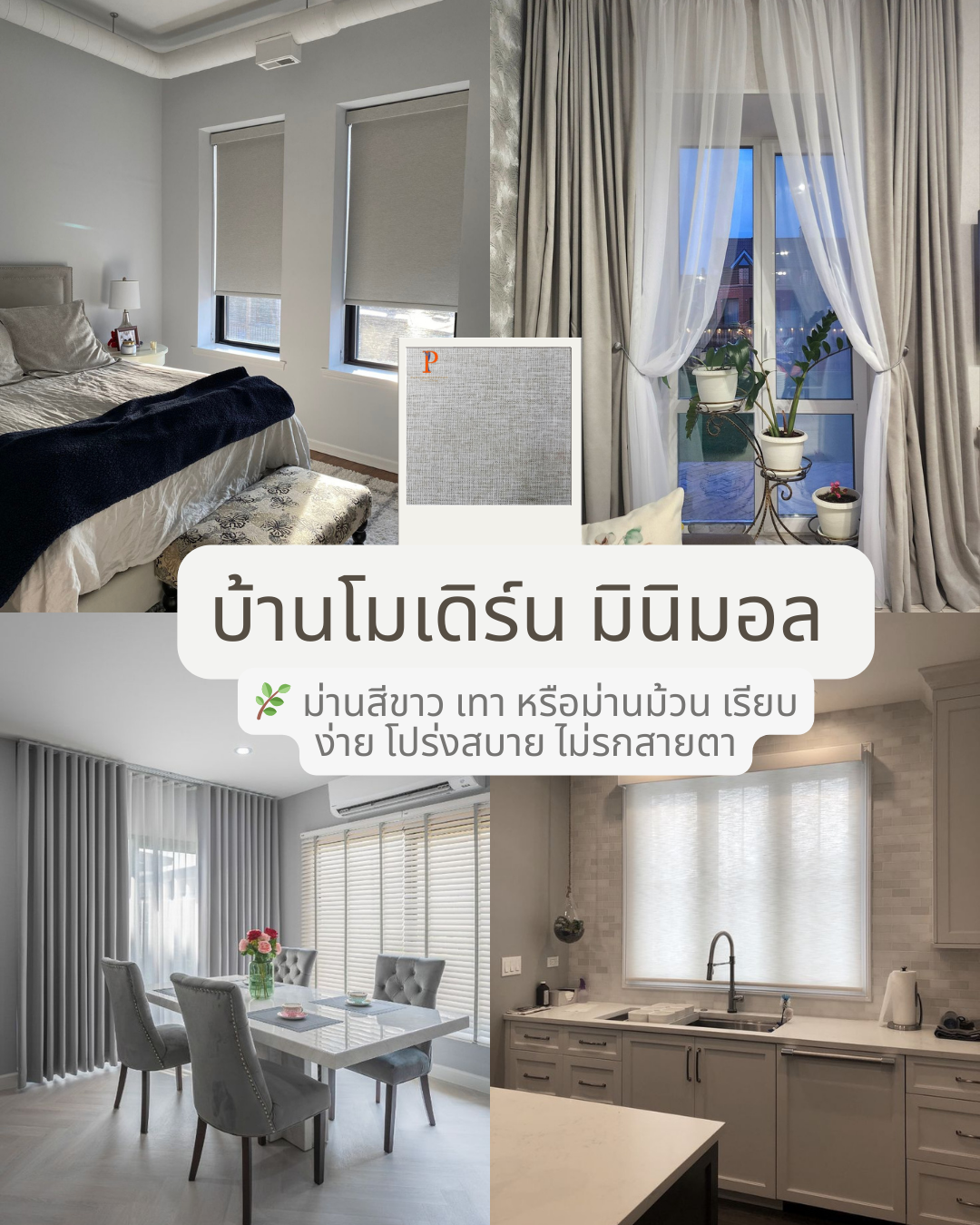 🌿 บ้านโมเดิร์น มินิมอล → ม่านสีขาว เทา หรือม่านม้วน เรียบง่าย โปร่งสบาย ไม่รกสายตา