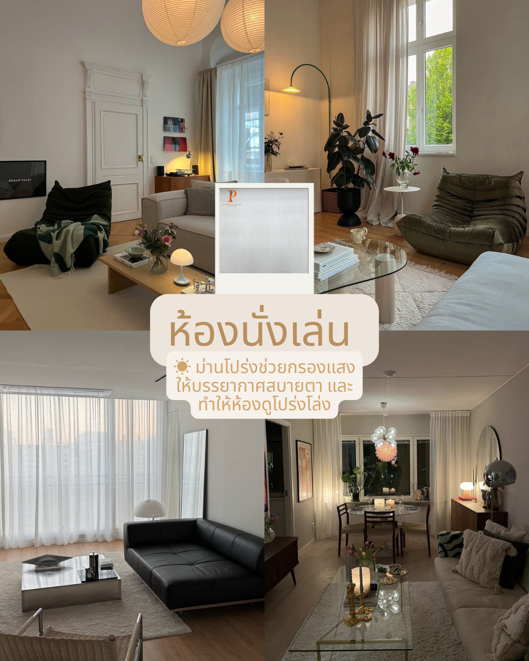 ☀ ห้องนั่งเล่น → ม่านโปร่งช่วยกรองแสง ให้บรรยากาศสบายตา และทำให้ห้องดูโปร่งโล่ง
